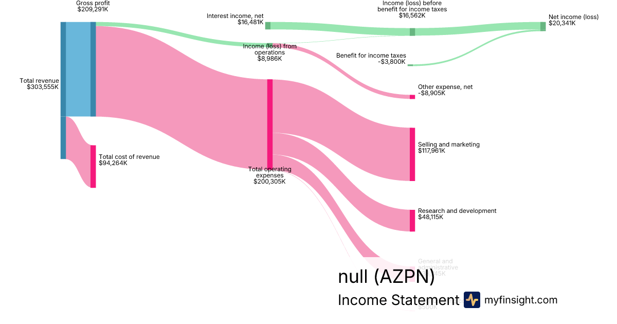 For the quarter ending 2024-12-31, AZPN made $303,555K in revenue. $20,341K in net income. Net profit margin of 6.70%.