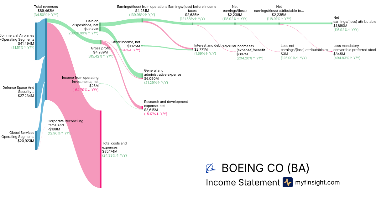 For the year ending 2025-12-31, BA made $89,463M in revenue. $1,890M in net income. Net profit margin of 2.11%.