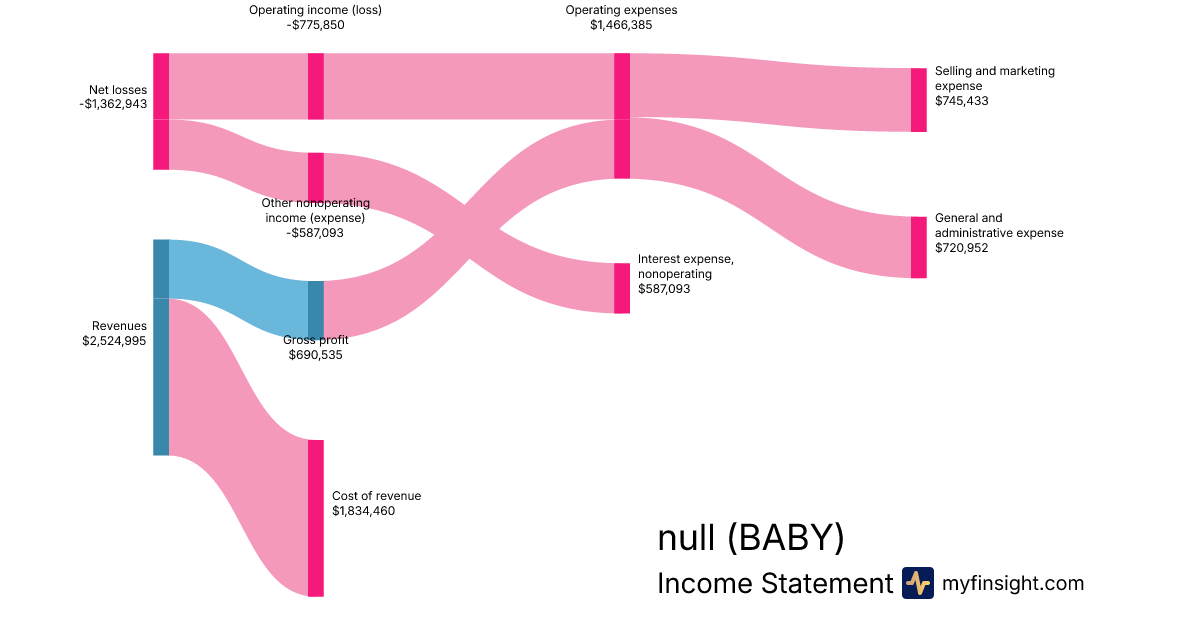 For the quarter ending 2024-09-30, BABY made $2,524,995 in revenue. -$1,362,943 in net income. Net profit margin of -53.98%.