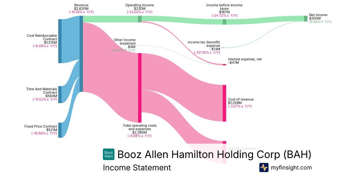 For the quarter ending 2025-12-31, BAH made $2,620M in revenue. $200M in net income. Net profit margin of 7.63%.