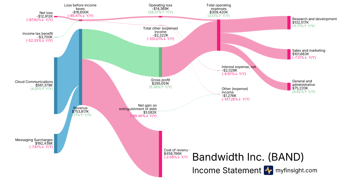 For the year ending 2025-12-31, BAND made $753,817K in revenue. -$12,912K in net income. Net profit margin of -1.71%.