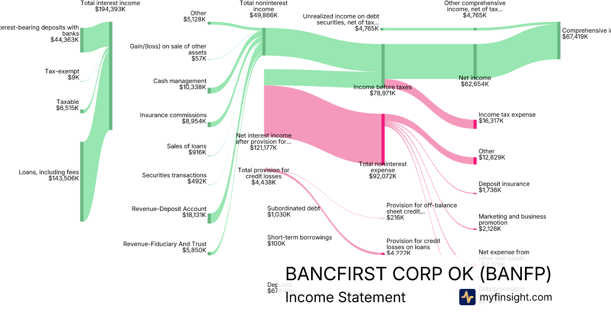 For the quarter ending 2025-09-30, BANFP made $408,756K in revenue. $67,419K in net income. Net profit margin of 16.49%.