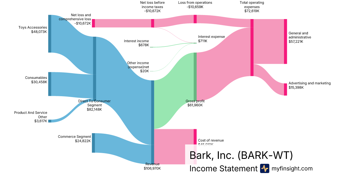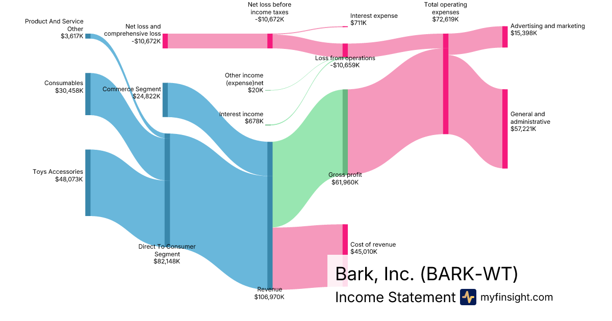 For the quarter ending 2025-09-30, BARK-WT made $106,970K in revenue. -$10,672K in net income. Net profit margin of -9.98%.