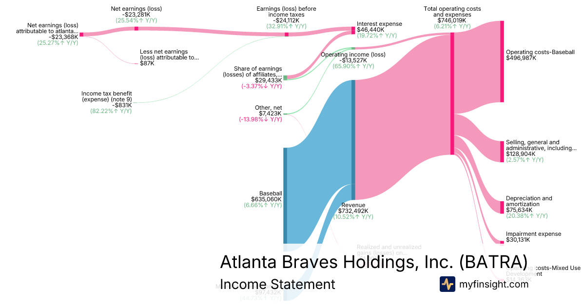 For the year ending 2025-12-31, BATRA made $732,492K in revenue. -$23,368K in net income. Net profit margin of -3.19%.