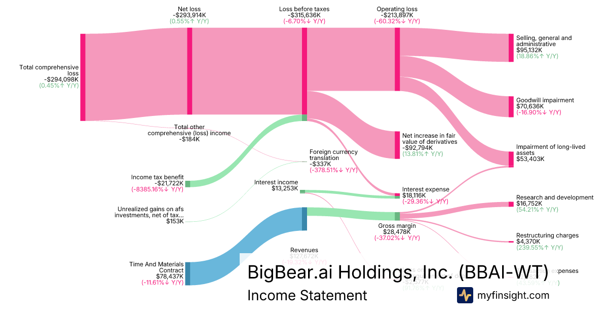 For the year ending 2025-12-31, BBAI-WT made $127,672K in revenue. -$294,098K in net income. Net profit margin of -230.35%.