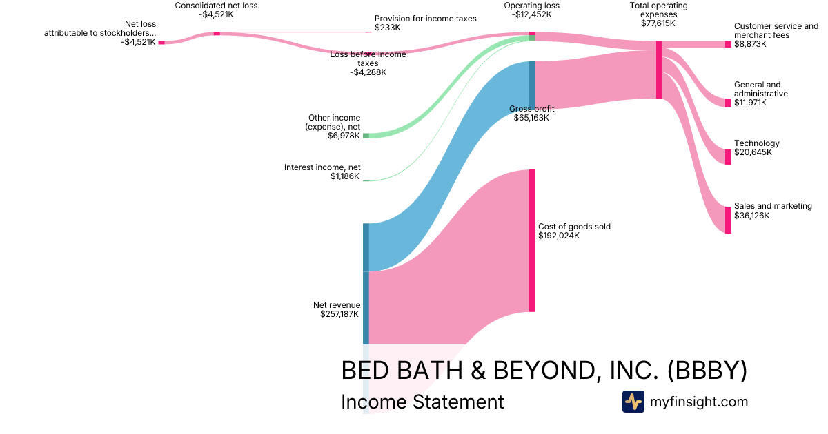 For the quarter ending 2025-09-30, BBBY made $257,187K in revenue. -$4,521K in net income. Net profit margin of -1.76%.