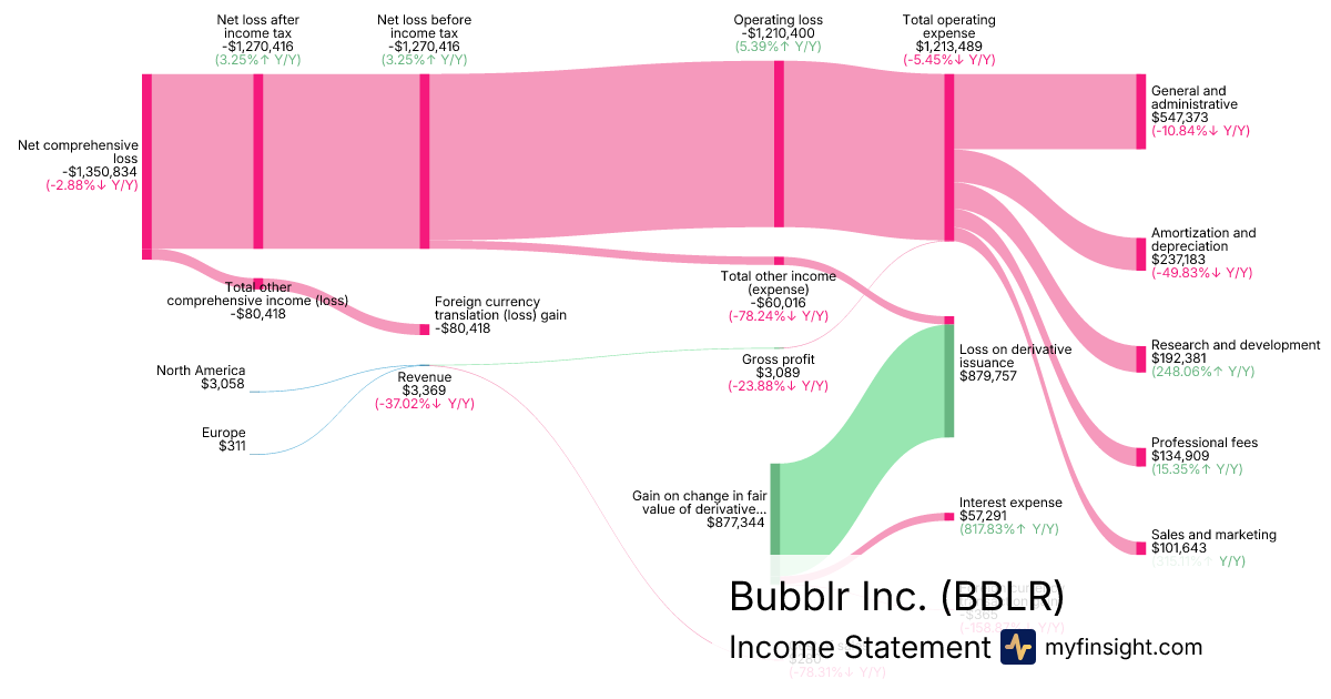 For the year ending 2025-12-31, BBLR made $3,369 in revenue. -$1,350,834 in net income. Net profit margin of -40095.99%.
