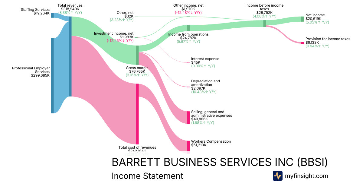 For the quarter ending 2025-09-30, BBSI made $318,949,000 in revenue. $20,619,000 in net income. Net profit margin of 6.46%.