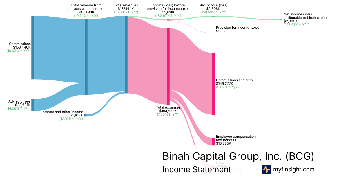 For the year ending 2025-12-31, BCG made $187,144K in revenue. $2,308K in net income. Net profit margin of 1.23%.