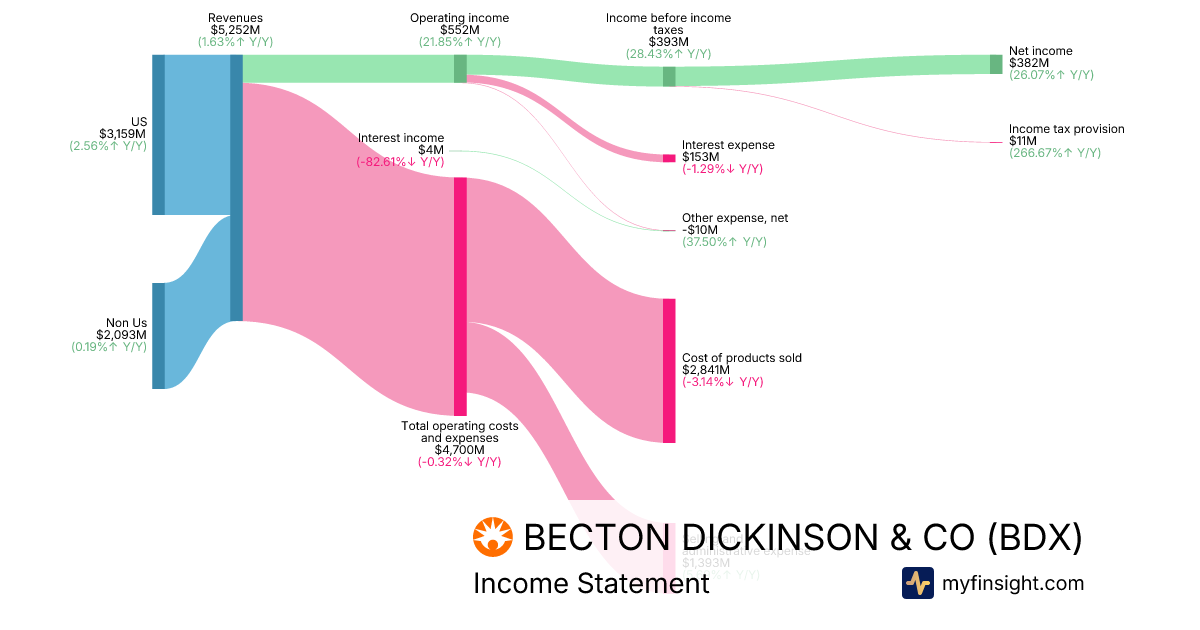 For the quarter ending 2025-12-31, BDX made $5,252M in revenue. $382M in net income. Net profit margin of 7.27%.