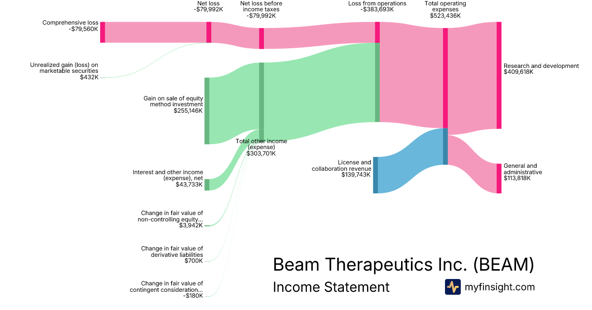 For the year ending 2025-12-31, BEAM made $139,743K in revenue. -$79,560K in net income. Net profit margin of -56.93%.