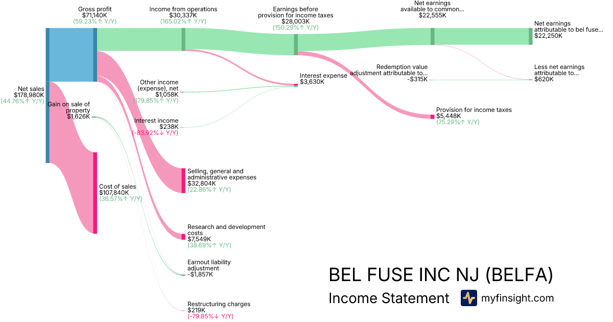 For the quarter ending 2025-09-30, BELFA made $178,980K in revenue. $22,250K in net income. Net profit margin of 12.43%.