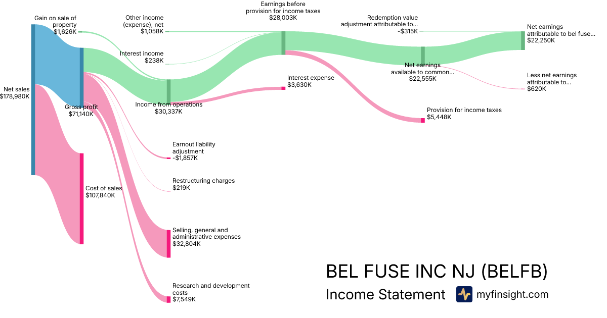 For the quarter ending 2025-09-30, BELFB made $178,980K in revenue. $22,250K in net income. Net profit margin of 12.43%.