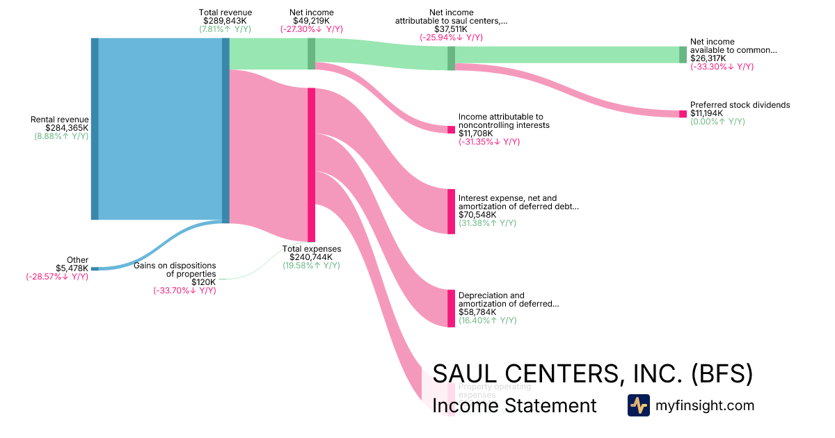 For the year ending 2025-12-31, BFS made $289,843K in revenue. $26,317K in net income. Net profit margin of 9.08%.