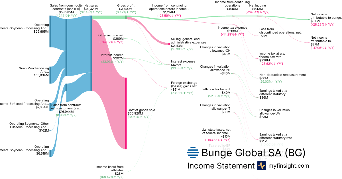 For the year ending 2025-12-31, BG made $70,329M in revenue. $816M in net income. Net profit margin of 1.16%.