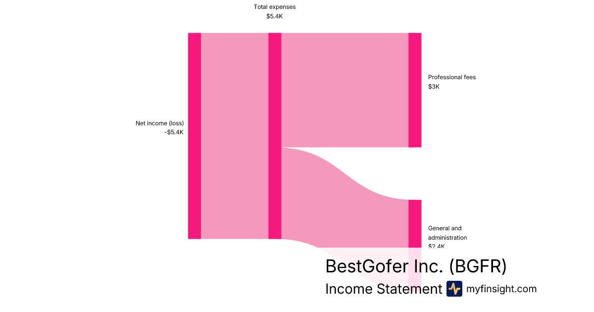 For the quarter ending 2025-08-31, BGFR made $5,400 in revenue. -$5,400 in net income. Net profit margin of -100.00%.