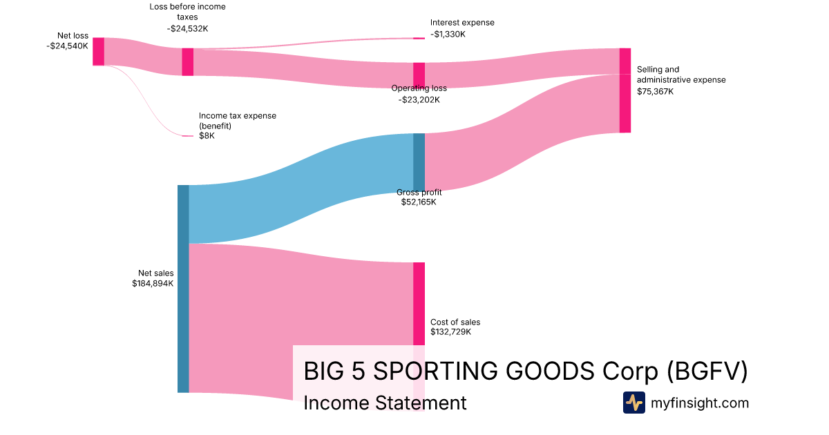 For the quarter ending 2025-06-29, BGFV made $184,894K in revenue. -$24,540K in net income. Net profit margin of -13.27%.
