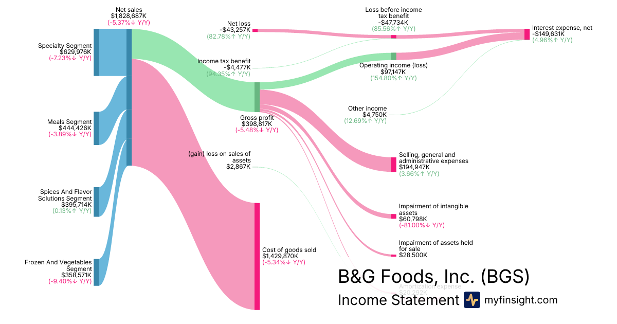 For the year ending 2026-01-03, BGS made $1,828,687K in revenue. -$43,257K in net income. Net profit margin of -2.37%.