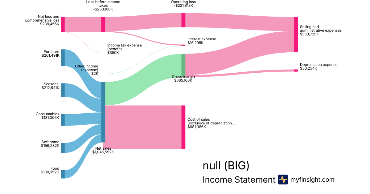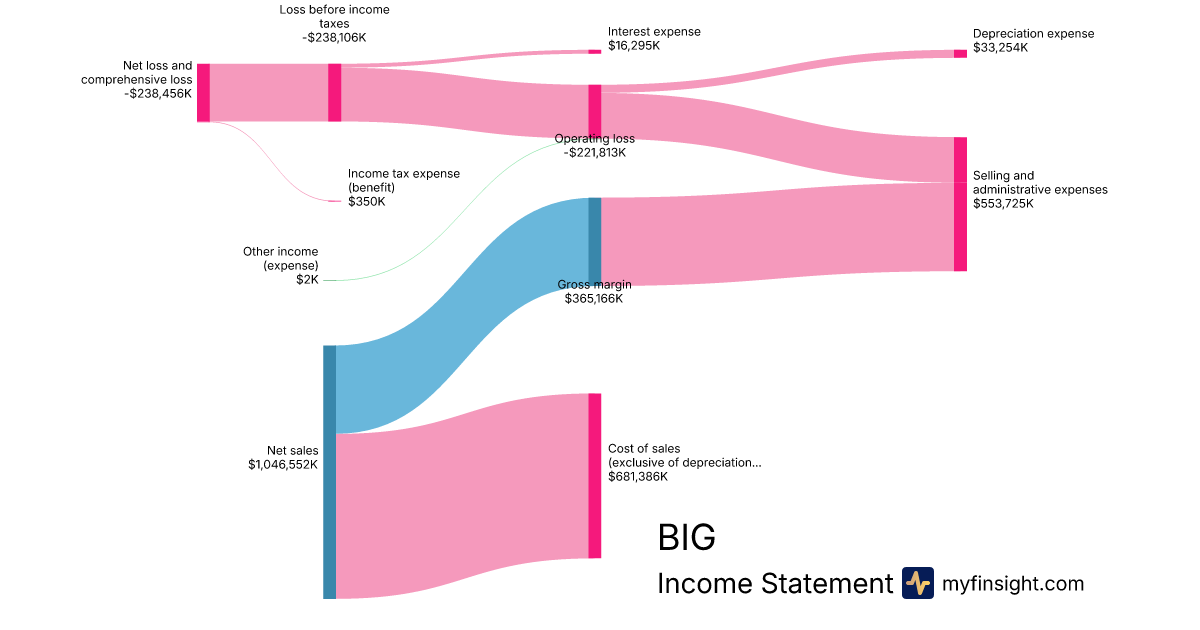 For the quarter ending 2024-08-03, BIG made $1,046,552K in revenue. -$238,456K in net income. Net profit margin of -22.78%.