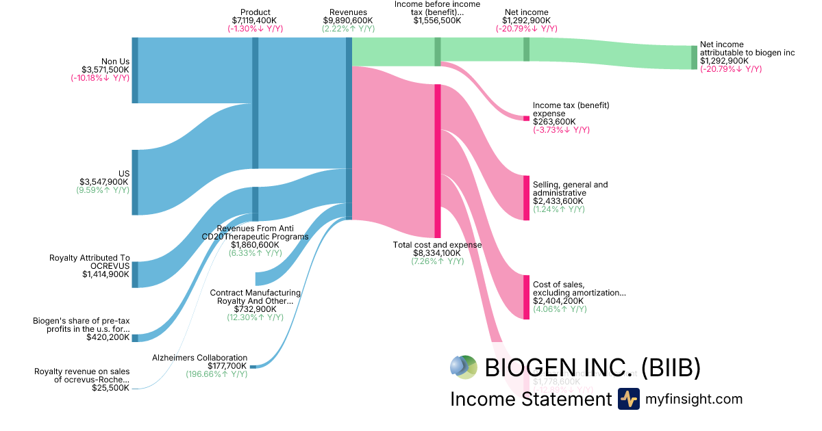 For the year ending 2025-12-31, BIIB made $9,890,600K in revenue. $1,292,900K in net income. Net profit margin of 13.07%.