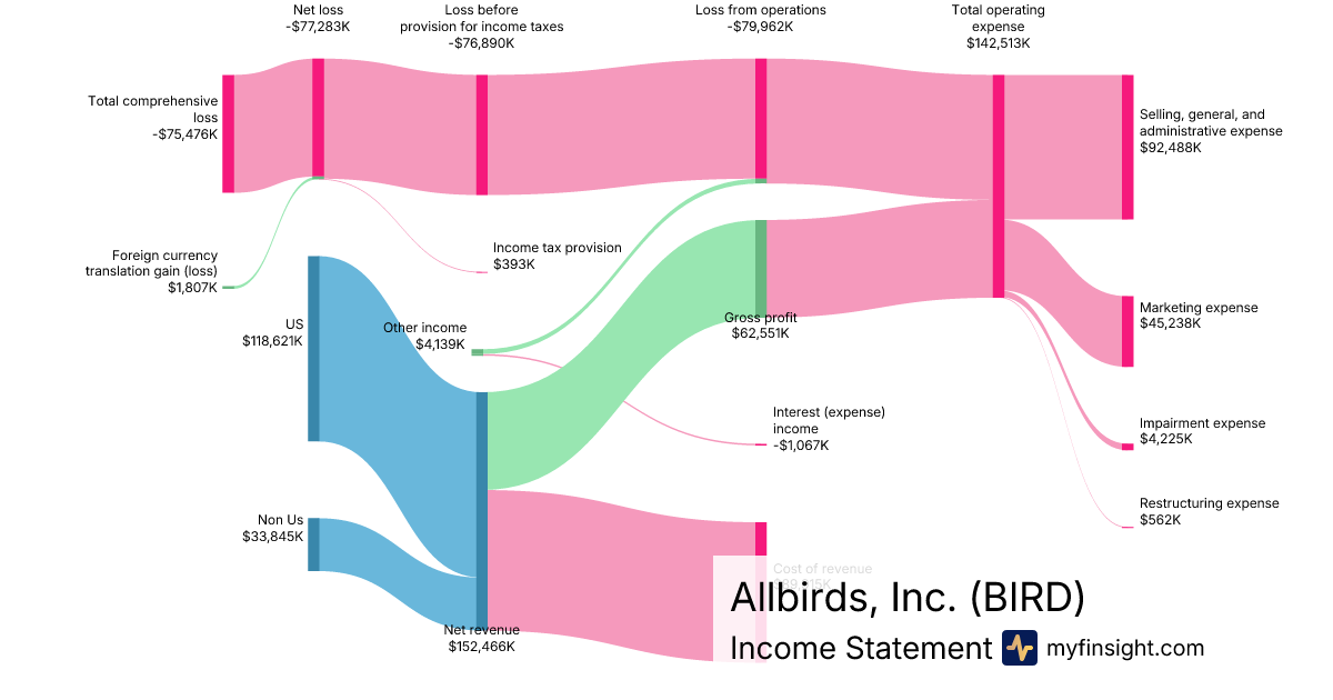 For the year ending 2025-12-31, BIRD made $152,466K in revenue. -$75,476K in net income. Net profit margin of -49.50%.
