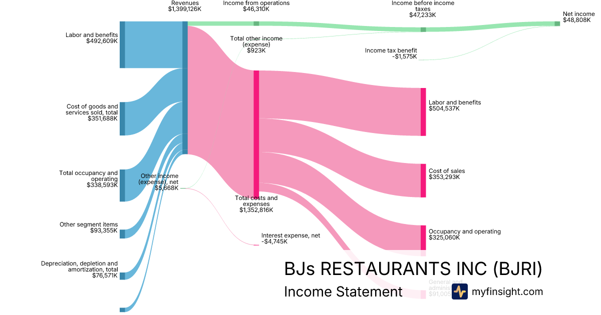 For the year ending 2025-12-30, BJRI made $1,399,126K in revenue. $48,808K in net income. Net profit margin of 3.49%.