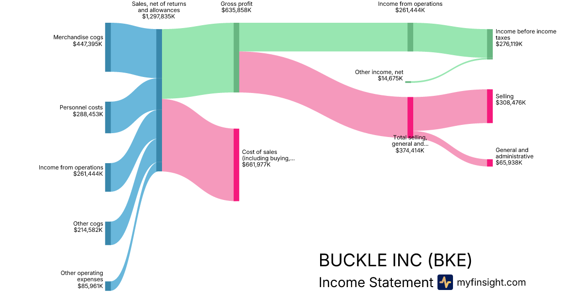 For the year ending 2026-01-31, BKE made $1,297,835K in revenue. $276,119K in net income. Net profit margin of 21.28%.