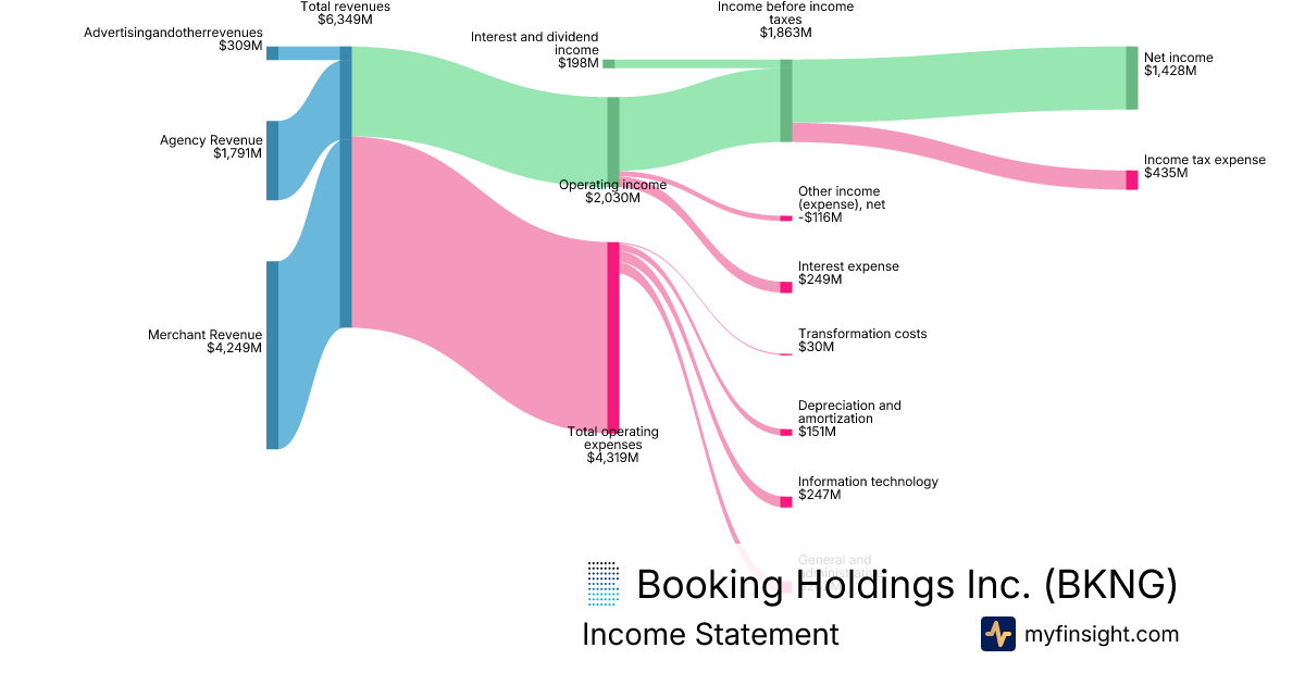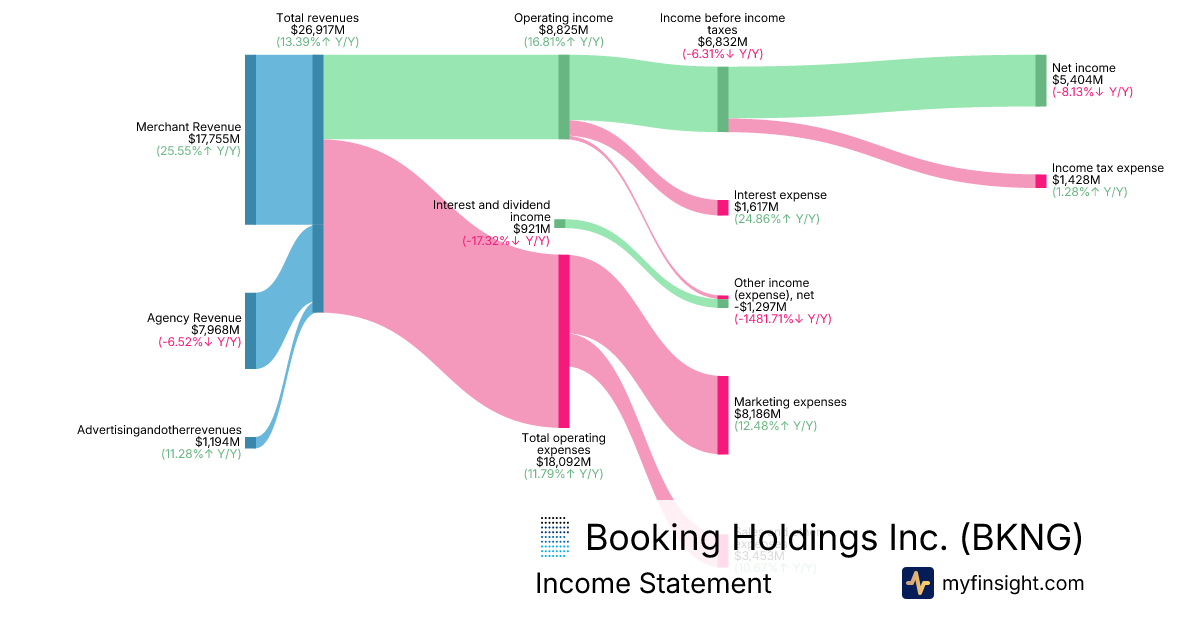 For the year ending 2025-12-31, BKNG made $26,917M in revenue. $5,404M in net income. Net profit margin of 20.08%.