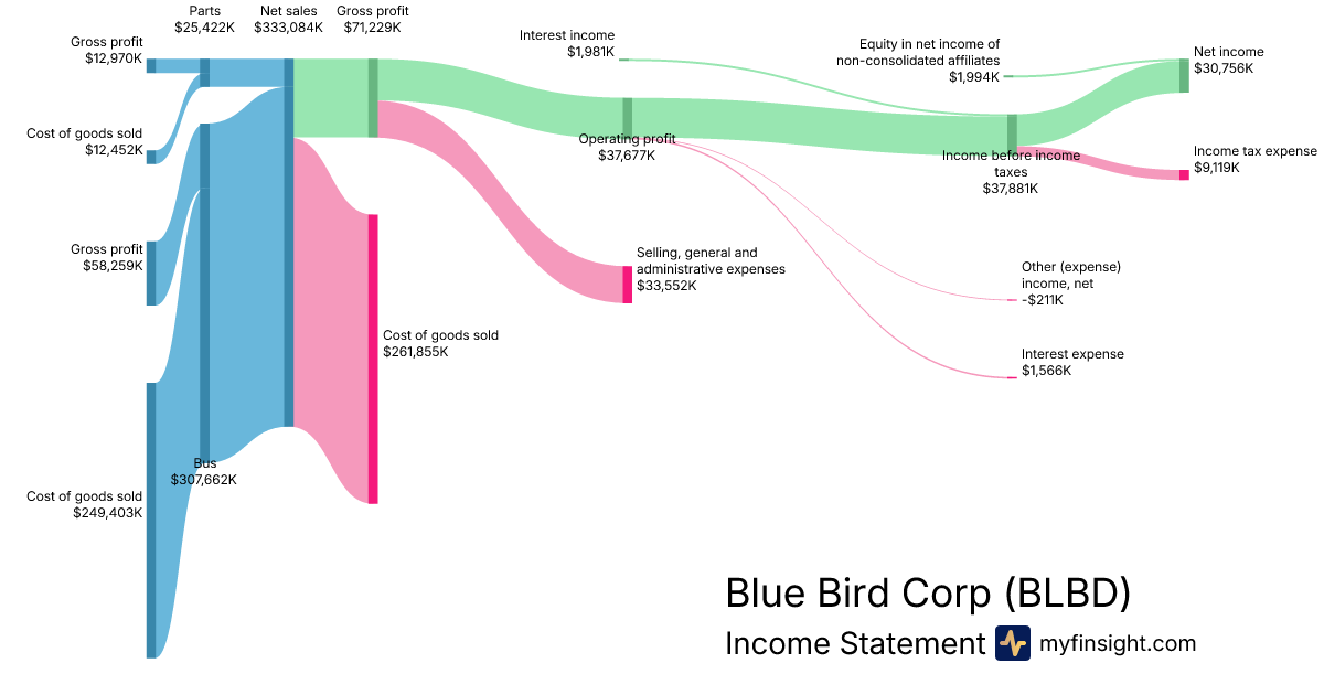 For the quarter ending 2025-12-27, BLBD made $333,084K in revenue. $30,756K in net income. Net profit margin of 9.23%.