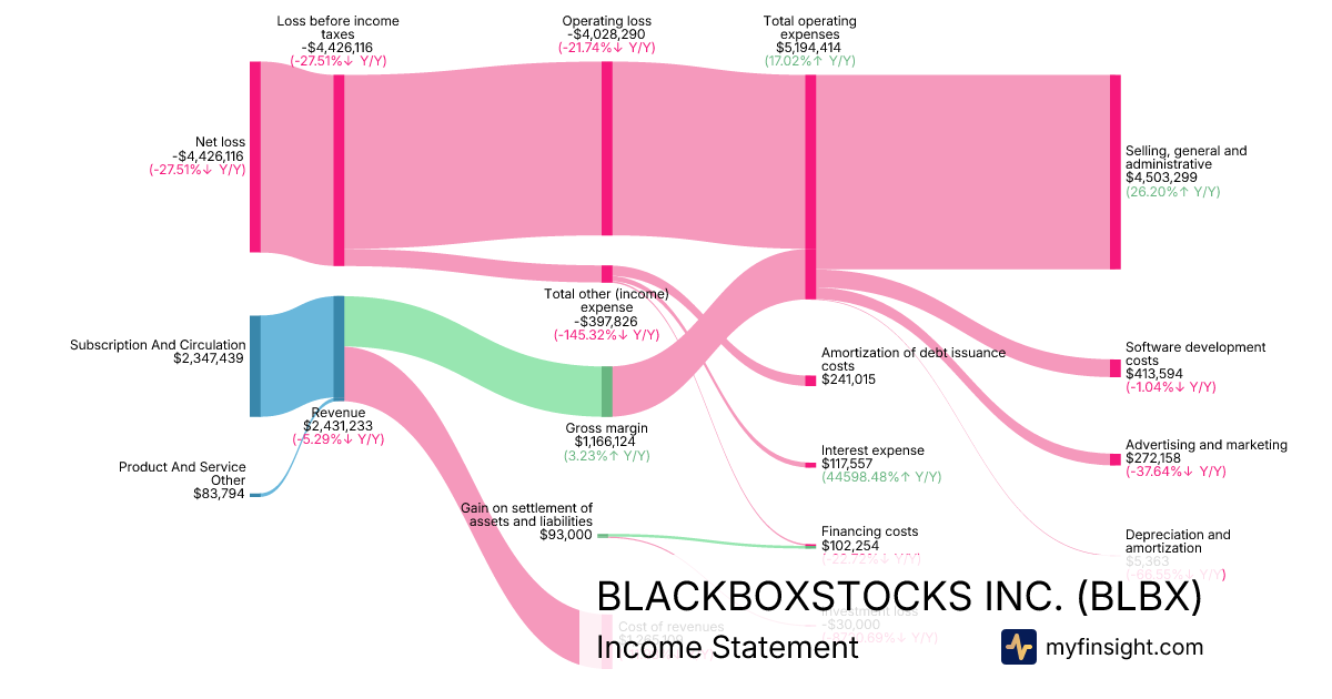 For the year ending 2025-12-31, BLBX made $2,431,233 in revenue. -$4,426,116 in net income. Net profit margin of -182.05%.