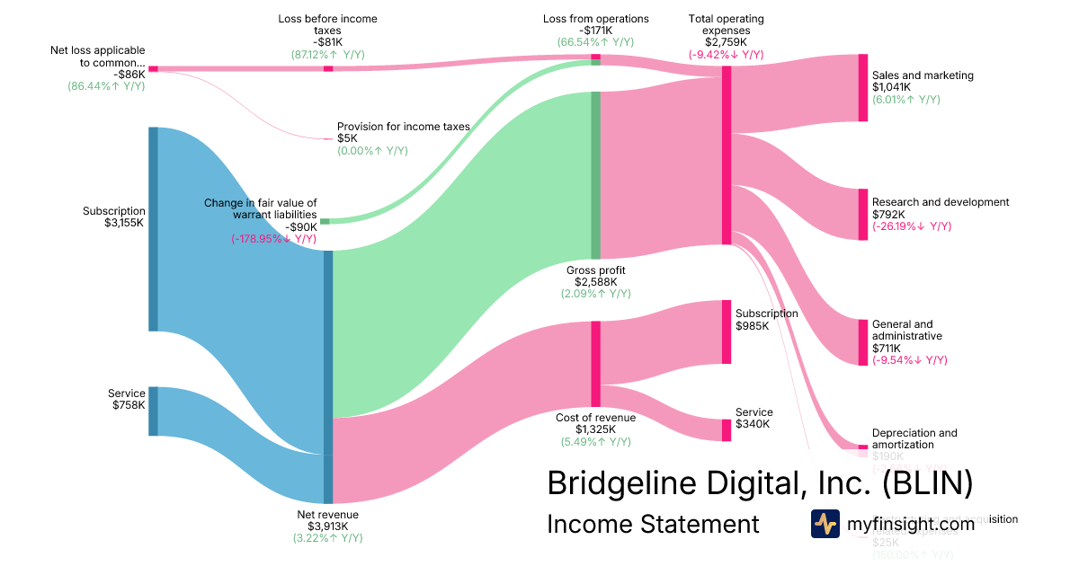For the quarter ending 2025-12-31, BLIN made $3,913K in revenue. -$86K in net income. Net profit margin of -2.20%.