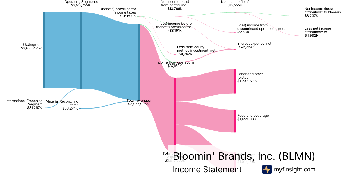 For the year ending 2025-12-28, BLMN made $3,955,996K in revenue. $8,237K in net income. Net profit margin of 0.21%.