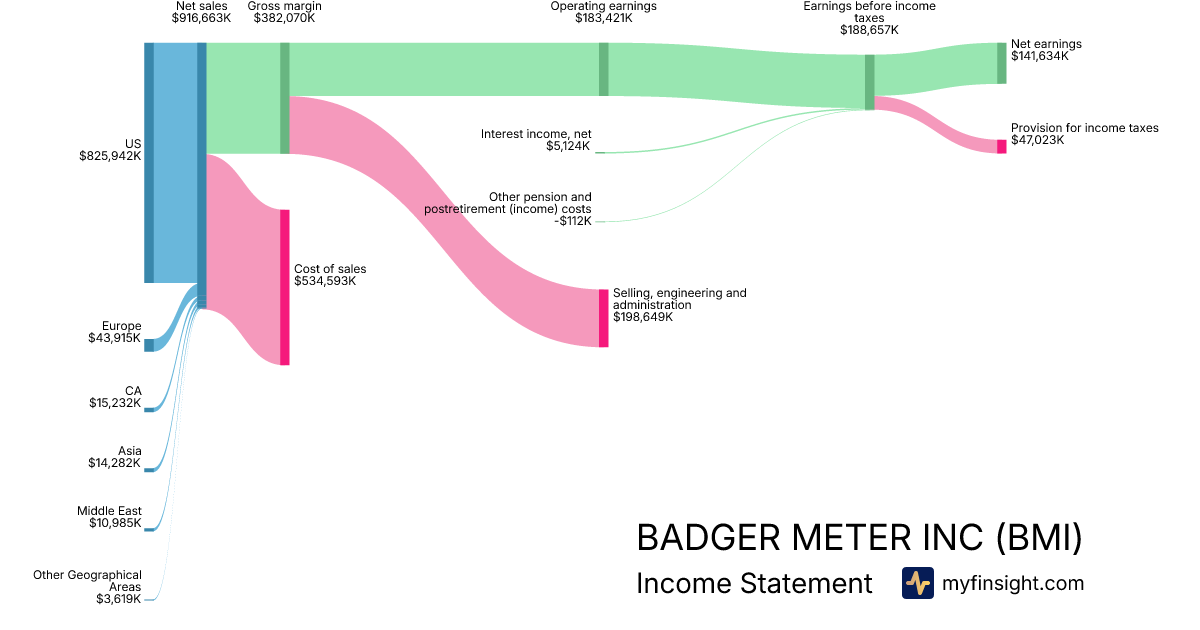 For the year ending 2025-12-31, BMI made $916,663K in revenue. $141,634K in net income. Net profit margin of 15.45%.
