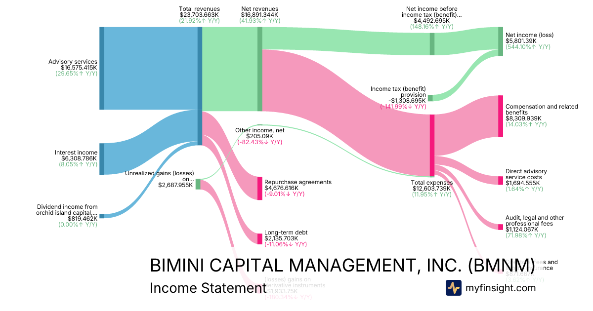 For the year ending 2025-12-31, BMNM made $23,703.663K in revenue. $5,801.39K in net income. Net profit margin of 24.47%.