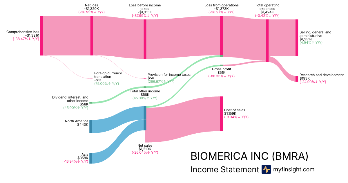 For the quarter ending 2025-11-30, BMRA made $1,210K in revenue. -$1,321K in net income. Net profit margin of -109.17%.
