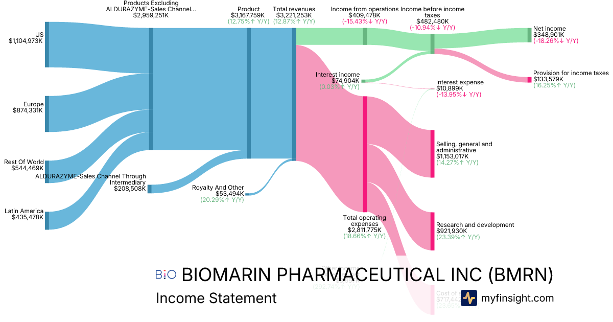 For the year ending 2025-12-31, BMRN made $3,221,253K in revenue. $348,901K in net income. Net profit margin of 10.83%.