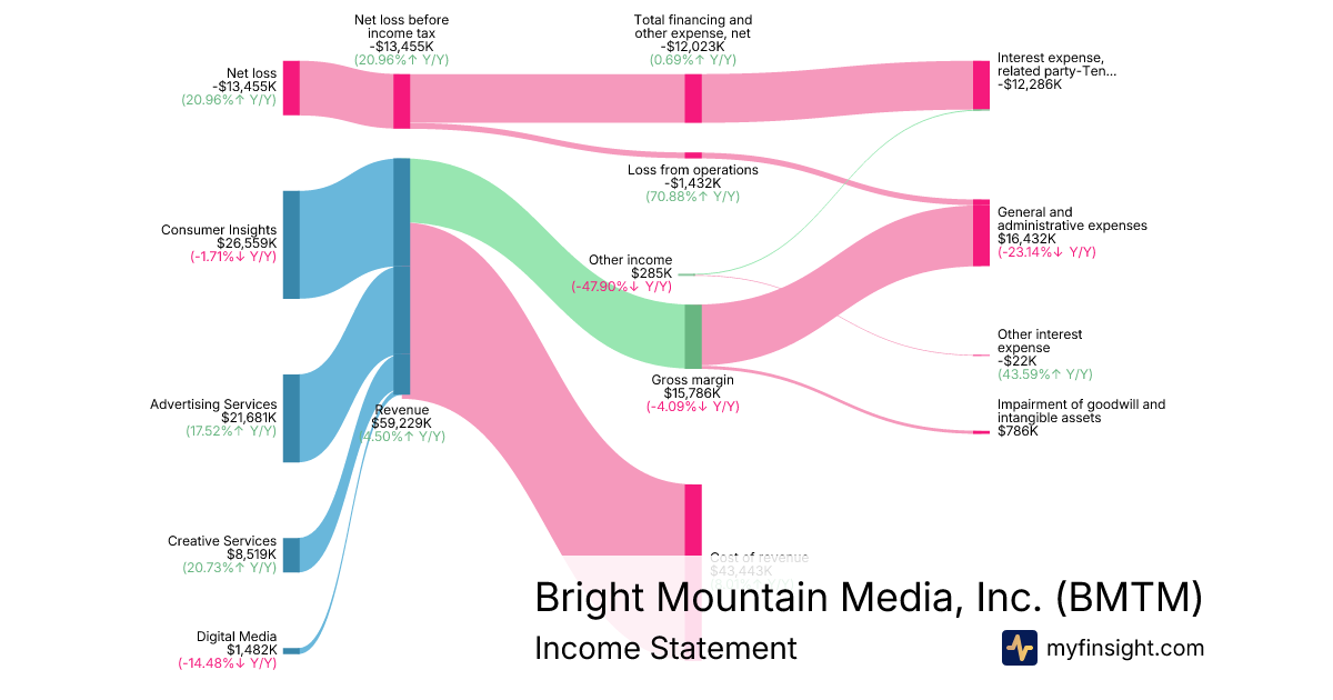 For the year ending 2025-12-31, BMTM made $59,229K in revenue. -$13,455K in net income. Net profit margin of -22.72%.