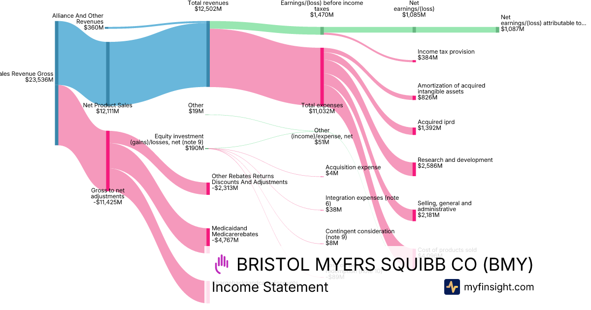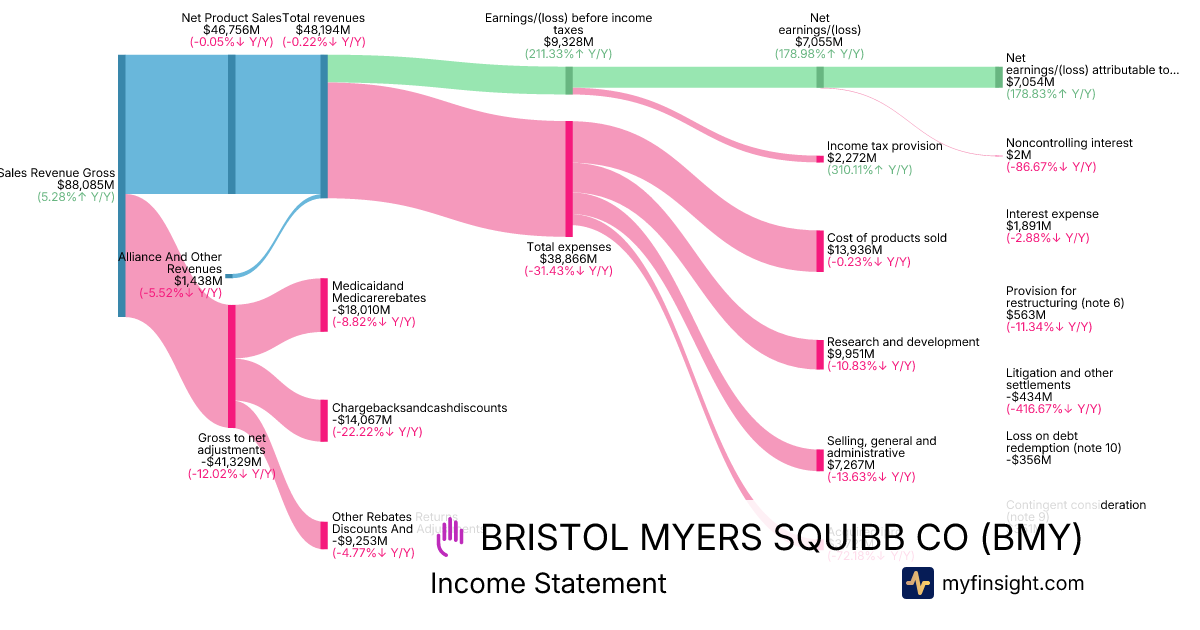 For the year ending 2025-12-31, BMY made $48,194M in revenue. $7,054M in net income. Net profit margin of 14.64%.