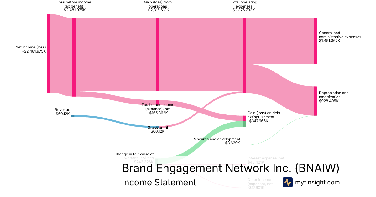 For the quarter ending 2025-09-30, BNAIW made $60.12K in revenue. -$2,481.975K in net income. Net profit margin of -4128.37%.