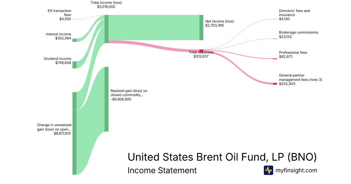 For the quarter ending 2025-09-30, BNO made $10,237,539 in revenue. $2,703,365 in net income. Net profit margin of 26.41%.