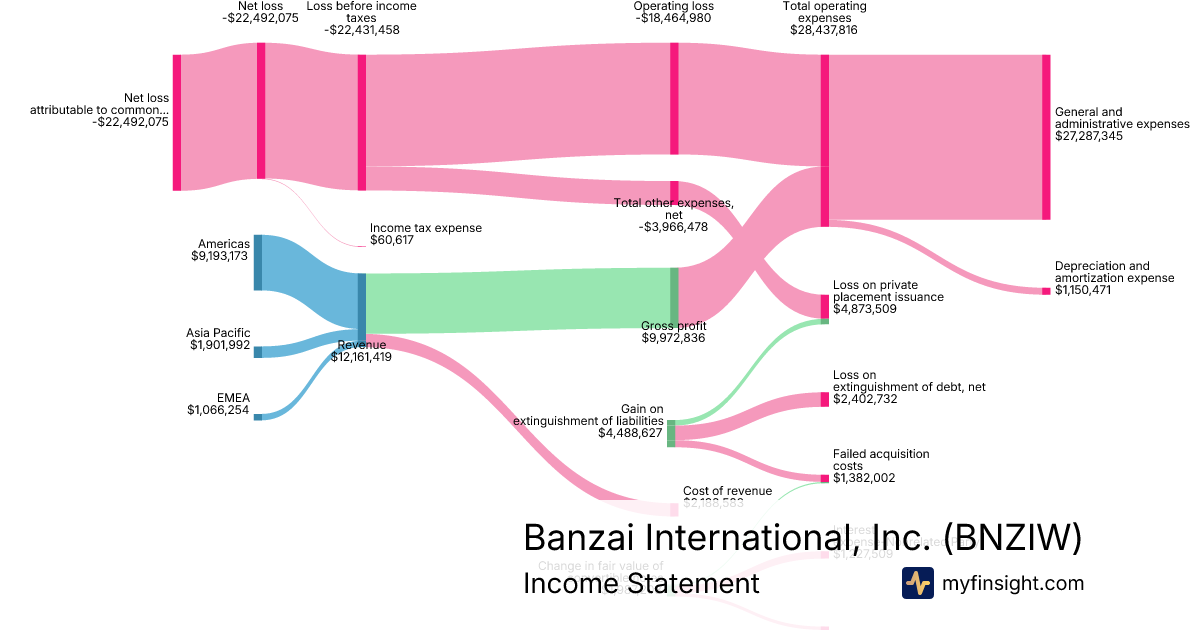 For the year ending 2025-12-31, BNZIW made $12,161,419 in revenue. -$22,492,075 in net income. Net profit margin of -184.95%.