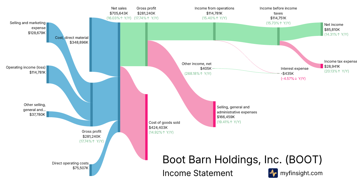 For the quarter ending 2025-12-27, BOOT made $705,643K in revenue. $85,810K in net income. Net profit margin of 12.16%.