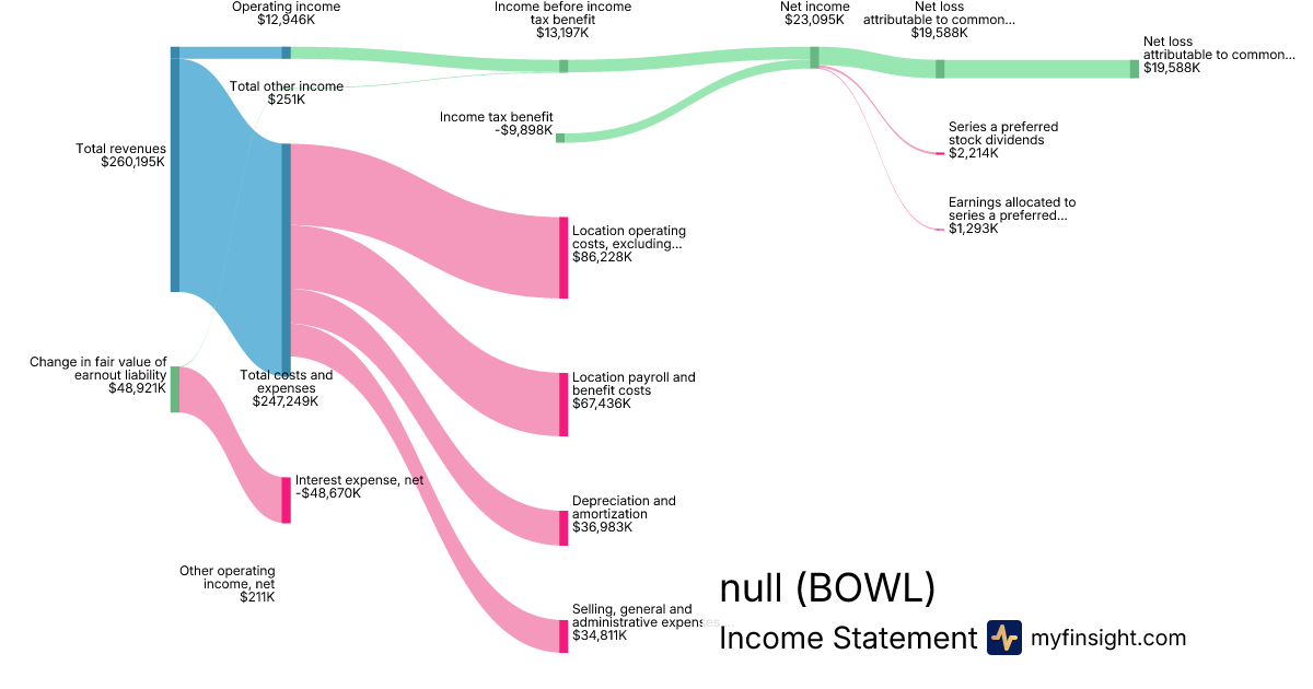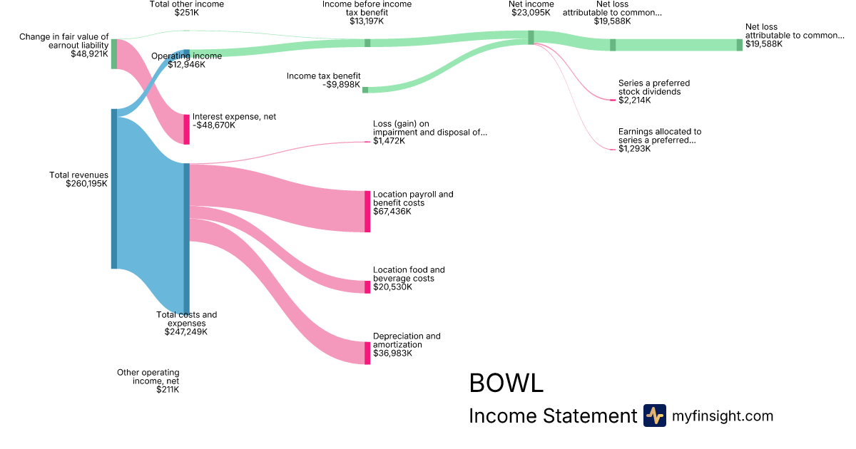 For the quarter ending 2024-09-29, BOWL made $260,195K in revenue. $19,588K in net income. Net profit margin of 7.53%.