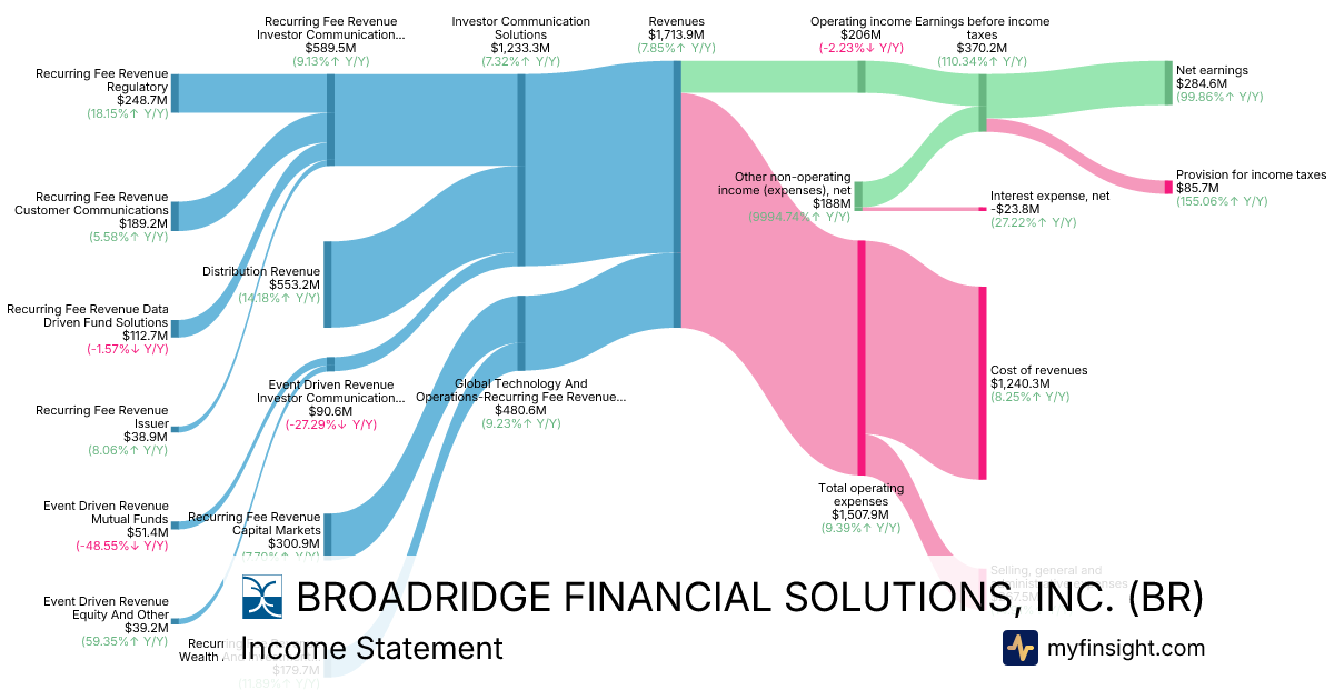 For the quarter ending 2025-12-31, BR made $1,713.9M in revenue. $284.6M in net income. Net profit margin of 16.61%.