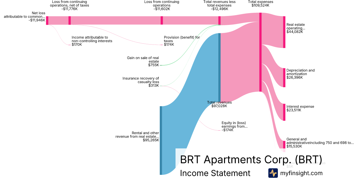 For the year ending 2025-12-31, BRT made $97,028K in revenue. -$11,946K in net income. Net profit margin of -12.31%.
