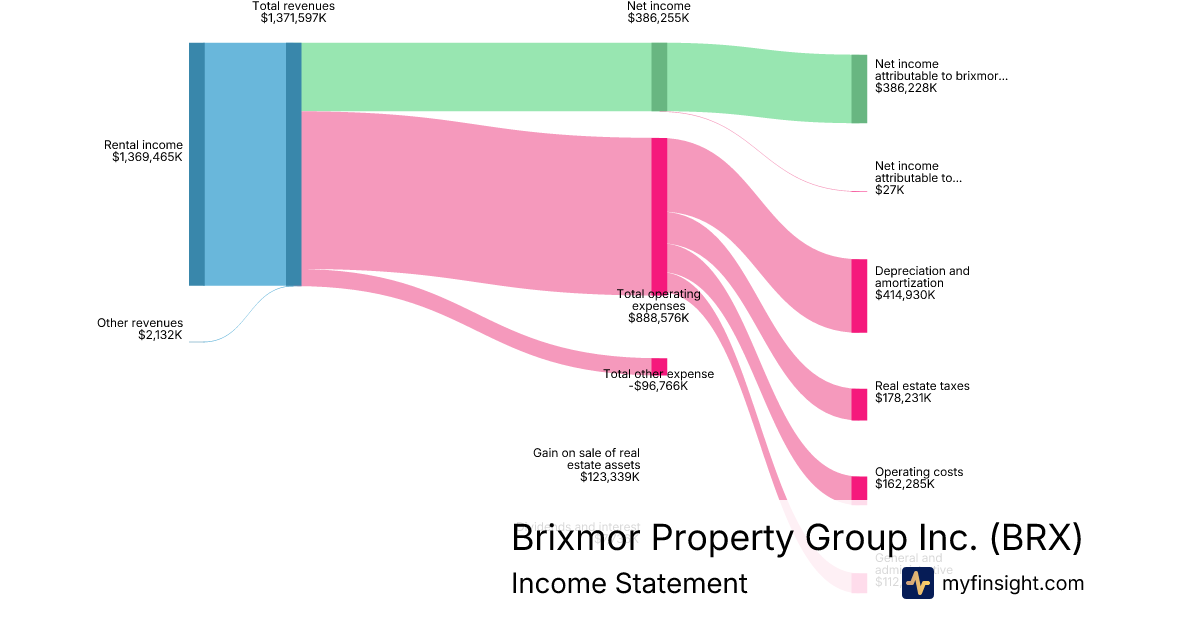 For the year ending 2025-12-31, BRX made $1,371,597K in revenue. $386,228K in net income. Net profit margin of 28.16%.