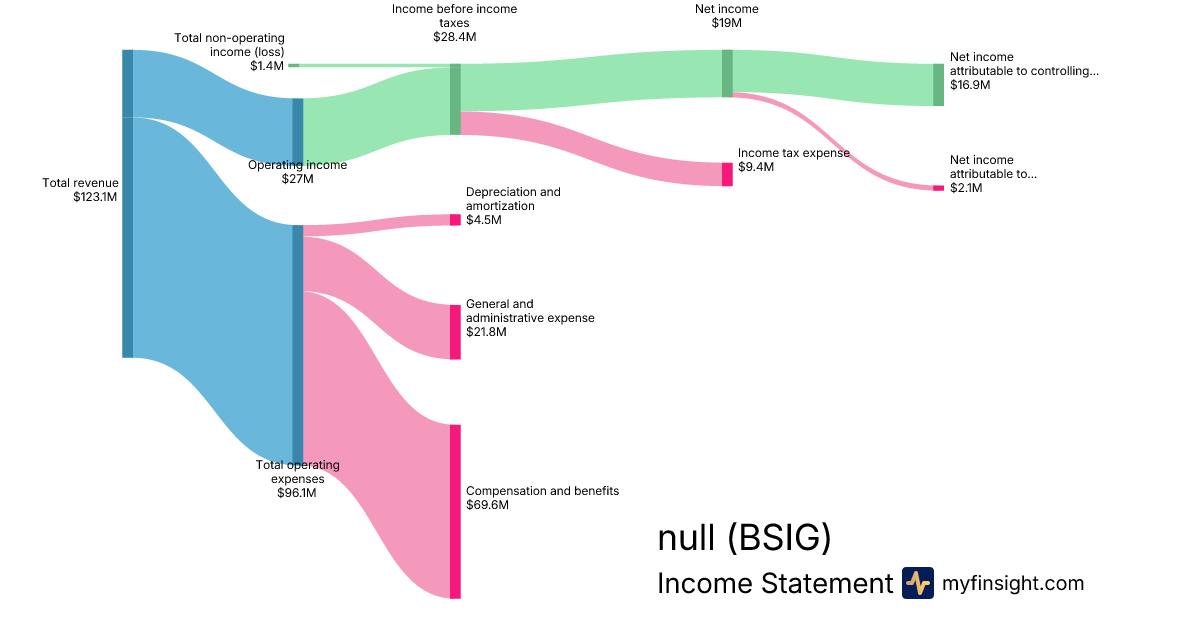 For the quarter ending 2024-09-30, BSIG made $123.1M in revenue. $16.9M in net income. Net profit margin of 13.73%.