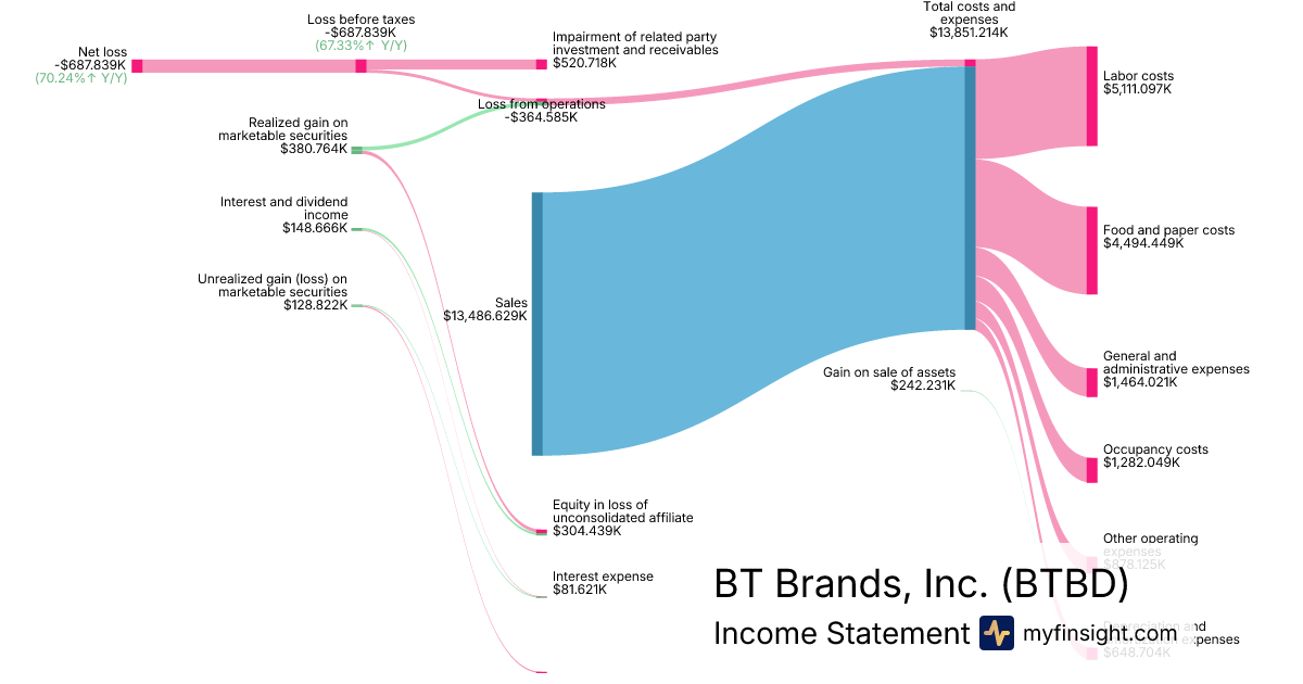 For the year ending 2025-12-28, BTBD made $13,486.629K in revenue. -$687.839K in net income. Net profit margin of -5.10%.
