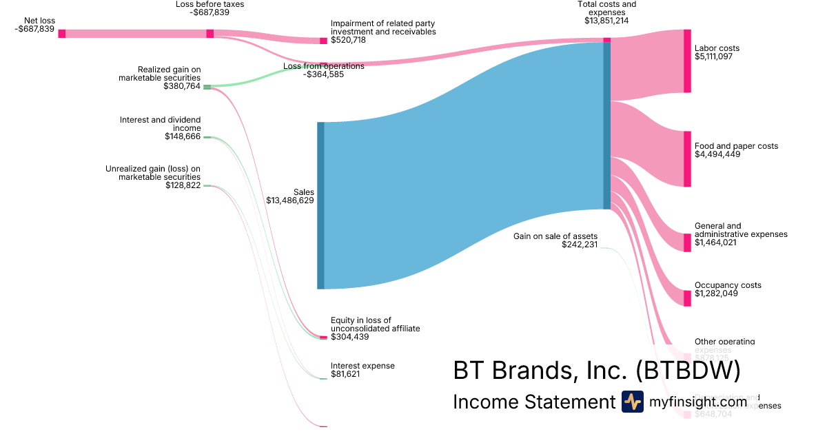 For the year ending 2025-12-28, BTBDW made $13,486,629 in revenue. -$687,839 in net income. Net profit margin of -5.10%.
