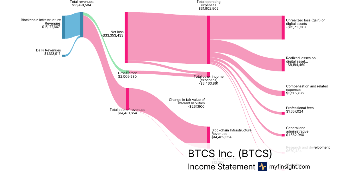 For the year ending 2025-12-31, BTCS made $16,491,584 in revenue. -$33,353,433 in net income. Net profit margin of -202.25%.